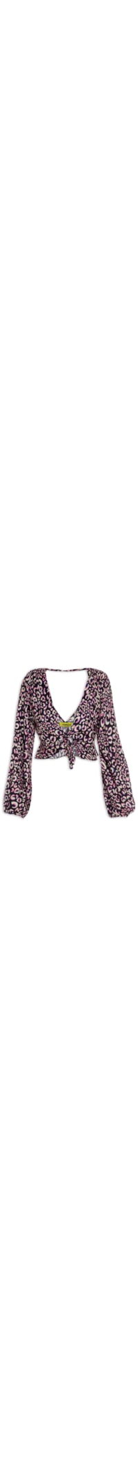 A blusa preta é confeccionada em tecido leve. A peça possui decote frontal e posterior V profundo, mangas longas bufantes, sem bojo, tira fina na parte posterior, tag da marca aplicada em metal na parte frontal, faixas alongadas na parte frontal, estampa abstrata em cores contrastantes, comprimento cropped*, shape solto e fechamento frontal por amarração.