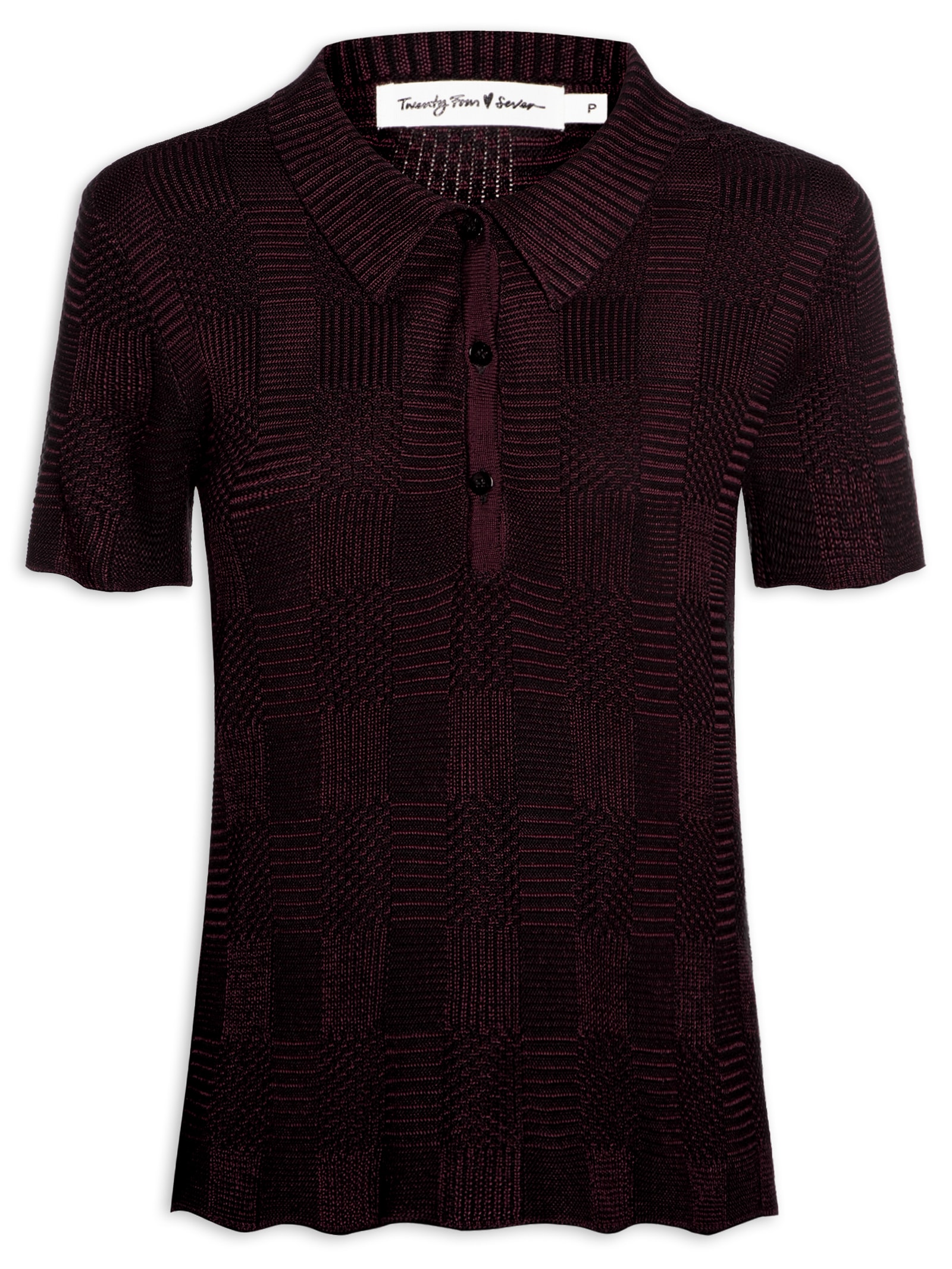 A blusa preta é confeccionado em tricot de média elasticidade. A peça solta ao corpo possui gola esporte com abotoamento, mangas curtas e padronagem xadrez na cor vinho.