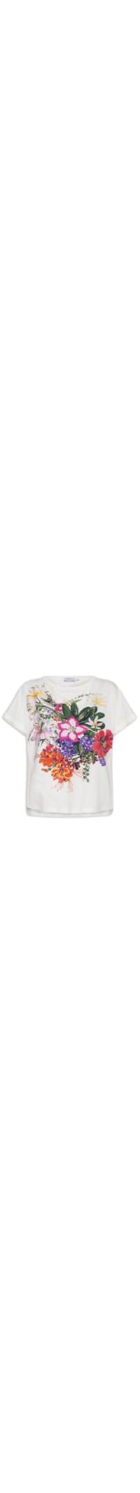 A blusa branca é confeccionada em malha leve de média elasticidade. A peça solta ao corpo, possui decote canoa, mangas curtas de modelo japonesa com barra italiana, estampa floral na parte frontal com mix de relevo aveludado e detalhes bordados em cores contrastantes, tag metálica da marca aplicada na parte posterior do decote e barra mullet* arredondada.