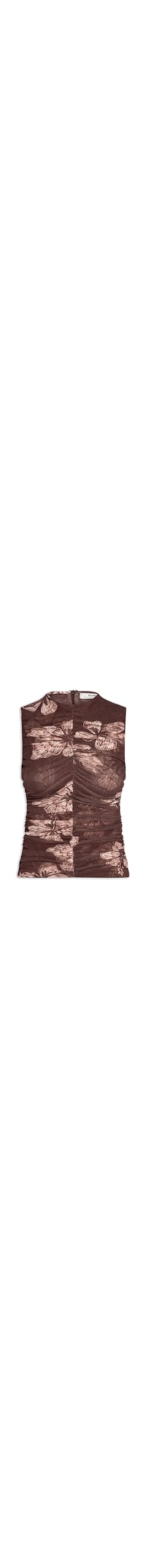 A blusa marrom é confeccionada em tule com média elasticidade e superfície franzida. A peça justa ao corpo possui decote redondo, alças largas, estampa floral na cor bege, transparência e fechamento posterior por zíper.