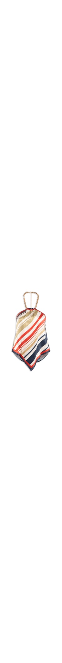 O body marrom é confeccionado em malha com baixa elasticidade. A peça solta ao corpo de modelo frente única possui decote trapézio, alça em corrente metálica, detalhe de elástico para ajuste na parte posterior, forro, barra assimétrica e estampa de listras em cores contrastantes.