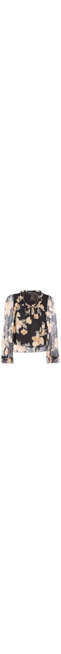 A blusa preta é confeccionada em tecido leve com baixa elasticidade. A peça solta ao corpo possui decote redondo, mangas longas amplas, babado nos punhos e no decote, cordões finos alongados na altura do decote para amarração, estampa floral em cores contrastantes, forro e leve transparência.