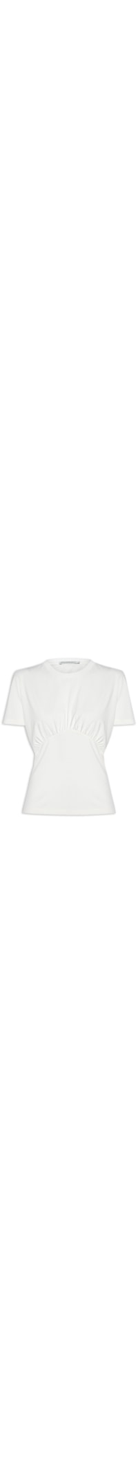 A blusa off white é confeccionada em malha de algodão com média elasticidade. A peça solta ao corpo possui decote redondo com acabamento canelado, mangas curtas, recorte com detalhe de franzido na parte frontal e posterior e tag da marca metalizada na parte posterior.