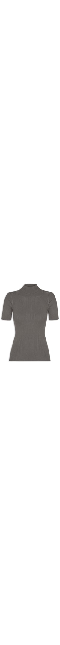 A blusa cinza é confeccionada em tricot com média elasticidade. A peça solta ao corpo possui gola alta, mangas curtas e acabamento canelado.