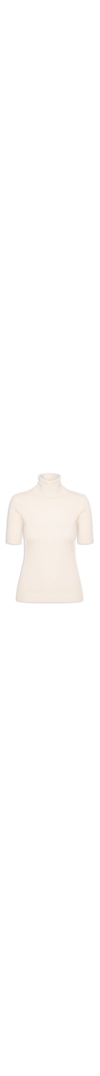 A blusa bege é confeccionada em tricot com média elasticidade. A peça justa ao corpo possui gola alta com acabamento canelado, mangas curtas, shape acinturado e barra com acabamento canelado.