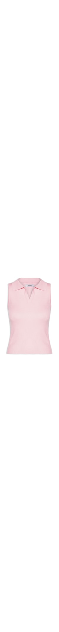 A blusa rosa é confeccionada em tricot com alta elasticidade. A peça solta ao corpo possui gola esporte, alças largas, cavas regulares e comprimento cropped*.