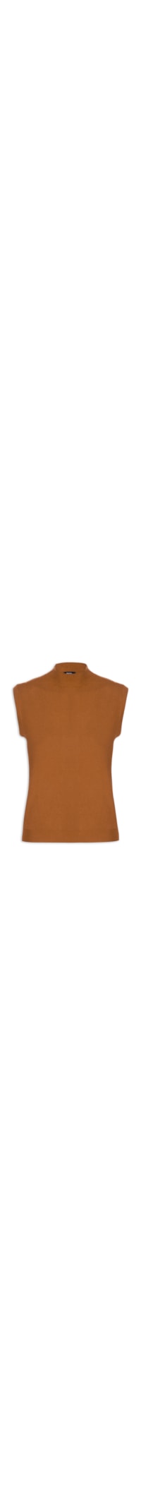 A blusa marrom é confeccionada em tricot com alta elasticidade. A peça solta ao corpo possui gola alta com acabamento canelado, cavas regulares e barra com acabamento canelado.