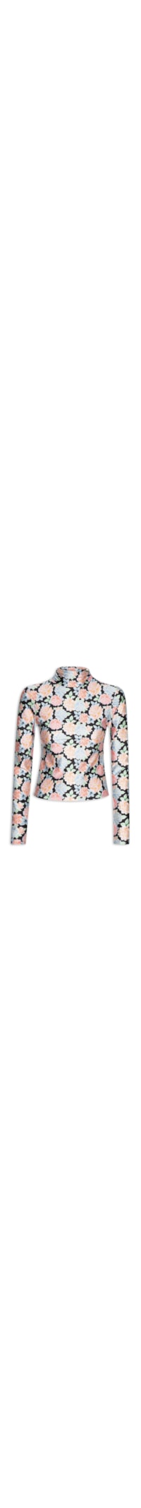 A blusa preta é confeccionada em malha cirrê de média elasticidade. A peça justa ao corpo possui gola alta com efeito franzido, mangas longas e estampa floral em cores contrastantes.
