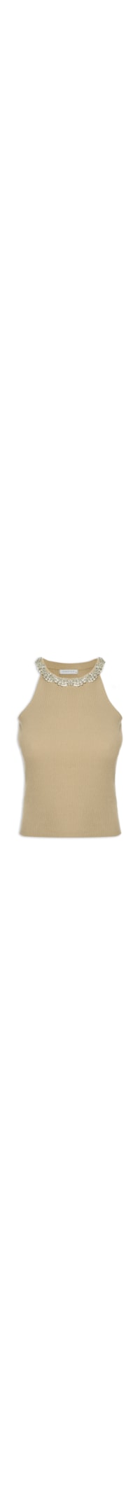 A blusa bege é confeccionado em tricot canelado. A peça possui decote trapézio com aplicações de strass na parte frontal, cavas regulares e shape justo.