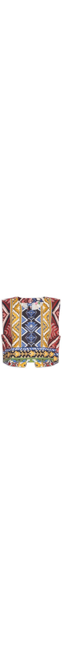 A blusa vermelha é confeccionada em tecido leve com toque de linho sem elasticidade. A peça solta ao corpo possui decote redondo, cavas regulares, estampa étnica em cores contrastantes, comprimento cropped*, acabamento pespontado e fechamento posterior por botões.