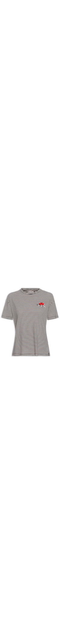 A blusa preta é confeccionada em malha de algodão com baixa elasticidade. A peça solta ao corpo possui decote redondo com acabamento canelado, mangas curtas, estampa figurativa em silk aplicada na parte frontal na altura do busto em cores contrastantes, padronagem de listras na cor branca e tag da marca metalizada aplicada no decote posterior.