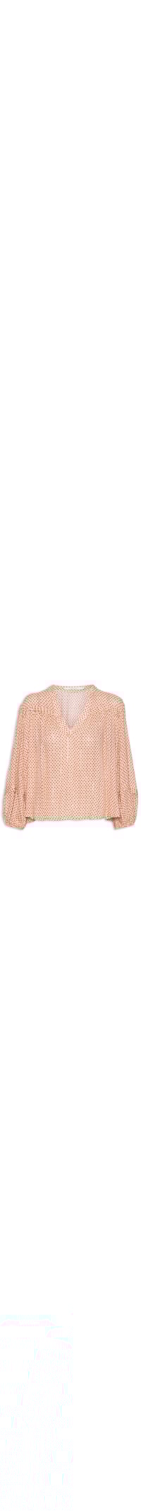 A blusa vermelha é confeccionada em tecido leve com fios de lurex e sem elasticidade. A peça solta ao corpo possui colarinho padre, decote V, mangas longas com elástico embutido nos punhos, recorte frontal e posterior com acabamento em corte a fio e detalhe de pregas, estampa em cor contrastante e leve transparência.