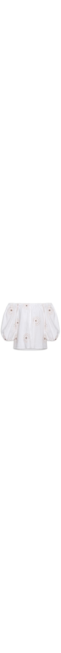 A blusa branca é confeccionada em tecido leve com toque de linho sem elasticidade. A peça solta ao corpo possui decote ombro a ombro com elástico embutido, mangas curtas bufantes, tachas metálicas e meio forro.