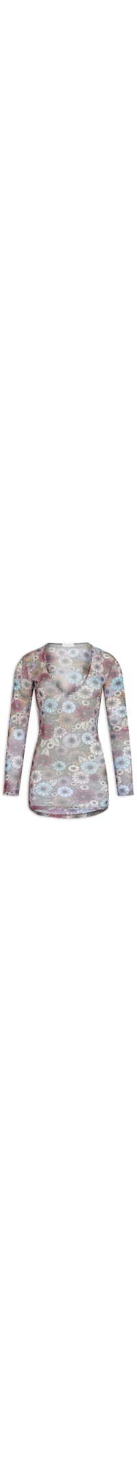 A blusa verde é confeccionada em tule. A peça justa ao corpo possui decote U, mangas longas, transparência, estampa floral em cores contrastantes e acabamento pespontado.