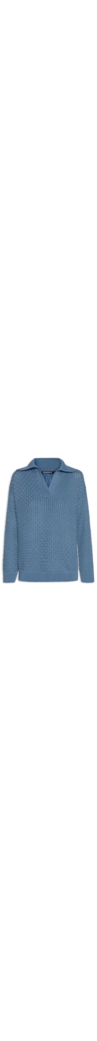 A blusa azul é confeccionada em tricot com superfície texturizada com baixa elasticidade. A peça solta ao corpo possui colarinho simples com decote V, mangas longas e acabamento canelado na gola, na barra e nas mangas.