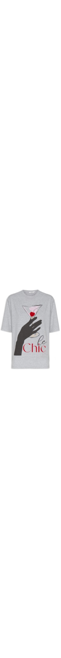 A blusa cinza é confeccionada malha de algodão com baixa elasticidade. A peça solta ao corpo possui decote redondo com acabamento canelado, mangas curtas e estampa figurativa na parte frontal em cores contrastantes e alto relevo.