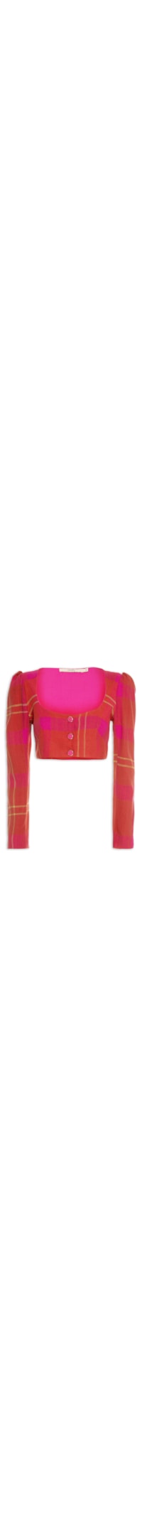 A blusa vermelha é confeccionada em tecido leve com toque de linho. A peça possui decote U, mangas longas, forro rosa, estampa xadrez em cores contrastantes, detalhe de franzido na altura dos ombros, pences frontais e posteriores na altura da barra, comprimento cropped*, shape solto, caimento reto, acabamento pespontado e fechamento frontal por botões.