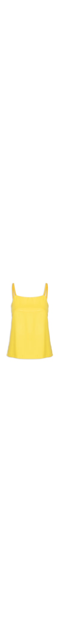 A blusa amarela é confeccionada em tecido leve. A peça possui decote reto, alças finas trançadas, cavas regulares, recorte posterior, tag da marca aplicada em metal na parte posterior na altura do decote, recortes frontais na altura do busto, shape solto, caimento reto e acabamento pespontado.