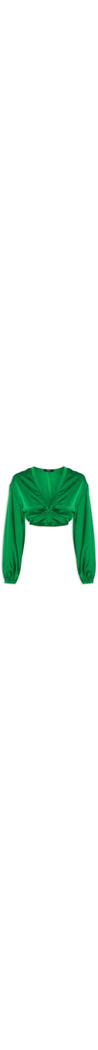 A blusa verde é confeccionada em cetim. A peça possui decote V profundo com detalhe de drapeado, mangas longas bufantes, ombros estendidos, tag da marca aplicada em metal na parte posterior, recorte frontal, comprimento cropped* e shape solto.