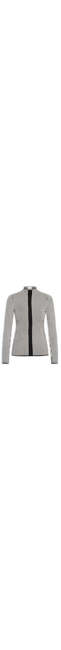 A blusa preta é confeccionada em tricot com alta elasticidade. A peça justa ao corpo possui gola alta, mangas longas e padronagem de listras na cor off white.