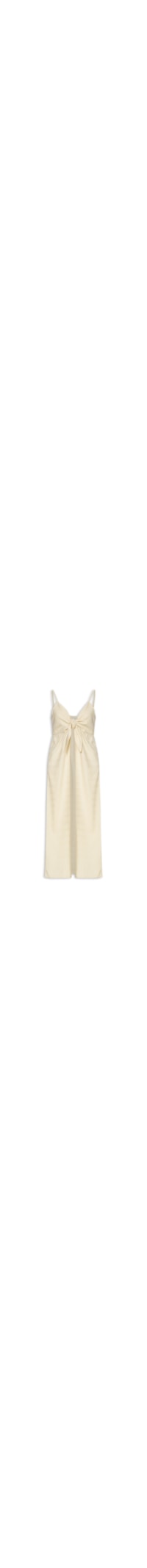 A blusa amarela é confeccionada em tecido leve com superfície texturizada. A peça possui decote V com tiras estendidas para amarração frontal em nó, alças finas reguláveis, recorte frontal e posterior abaixo do busto com detalhes de pregas, padronagem de listras no tecido, comprimento longo, shape solto e fechamento frontal por amarração.