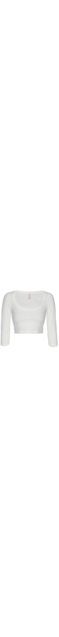 A blusa off white é confeccionada em malha canelada. A peça possui decote redondo, mangas 3/4, tag da marca aplicada em metal na parte posterior na altura do decote, comprimento cropped* e shape justo.