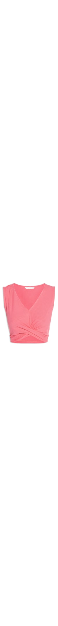 A blusa rosa é confeccionada em malha canelada. A peça possui decote V com tag metalizada da marca aplicada na parte posterior, alças largas, cavas regulares, recortes frontais transpassados com detalhes laterais de franzidos, comprimento cropped* e shape justo.