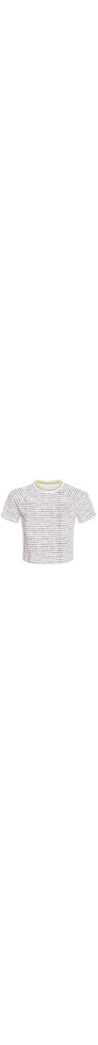 A blusa branca é confeccionada por malha leve com alta elasticidade. A peça solta ao corpo possui decote redondo com acabamento canelado e linhas em cores contrastantes, mangas curtas, tag da marca metalizada aplicada na parte posterior, padronagem poá em cor contrastante e comprimento cropped*.