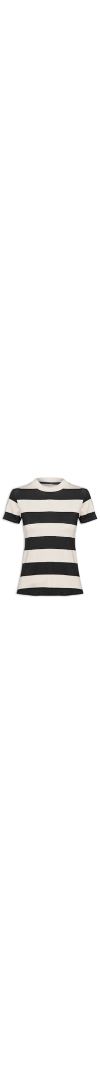 A blusa off white é confeccionada em malha com alta elásticidade. A peça solta ao corpo possui gola alta, mangas curtas, tag da marca metalizada aplicada na gola posterior e estampas listradas.
