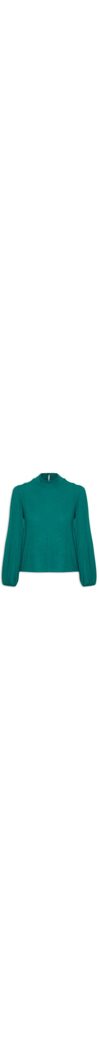 a blusa Verde é Confeccionada Em malha. A Peça Possui Gola Alta, Mangas Longas Bufantes Com Detalhes De Pregas Na Altura Dos Ombros, Recorte Posterior Em Gota Com Fechamento Por Botões E Shape Solto.