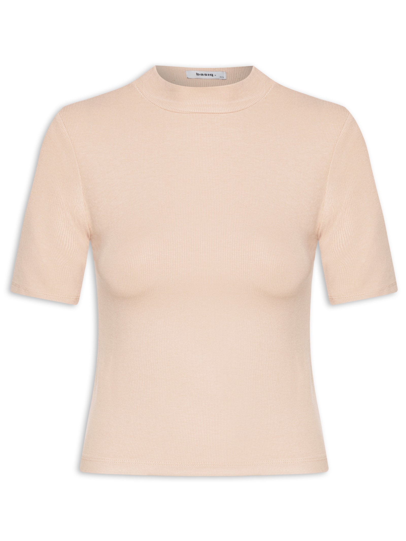 A blusa bege é confeccionada em malha leve com superfície canelada de média elasticidade. A peça justa ao corpo, possui gola alta e mangas curtas.