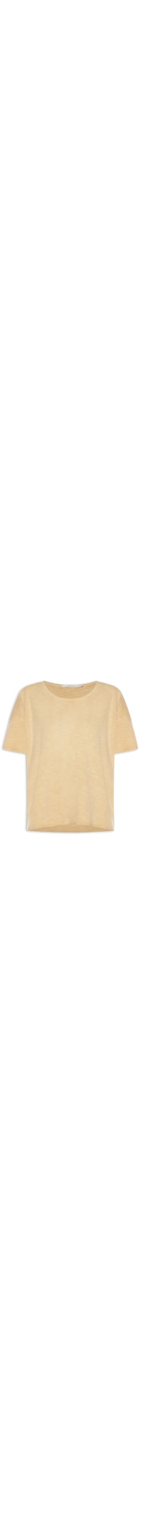 A blusa bege é confeccionada em malha flamê. A peça possui decote redondo, mangas curtas, ombros estendidos, shape solto, caimento reto e acabamento em corte à fio.
