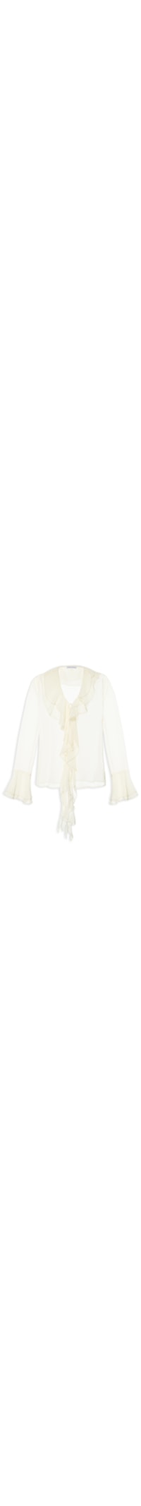 A blusa amarela é confeccionada em tecido leve sem elasticidade. A peça solta ao corpo possui decote V, mangas longas com recorte com efeito de babados no punho, tiras alongadas sobrepostas com efeito de babados aplicadas na parte frontal, leve transparência e fechamento frontal por amarração.