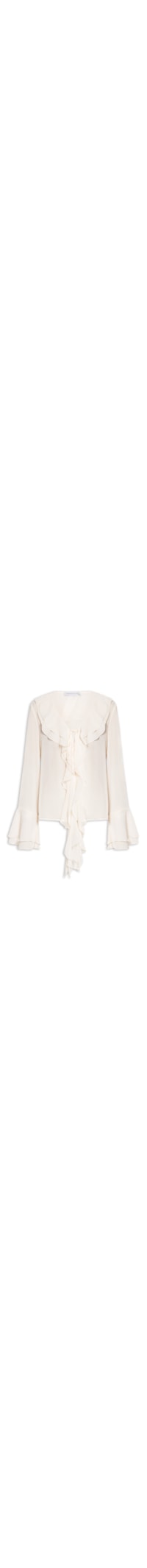 A blusa bege é confeccionada em tecido leve sem elasticidade. A peça solta ao corpo possui decote V, manga longa, média transparência, tecidos sobrepostos com efeito de babado na parte frontal, posterior e nas mangas, tiras alongadas no busto para amarração.