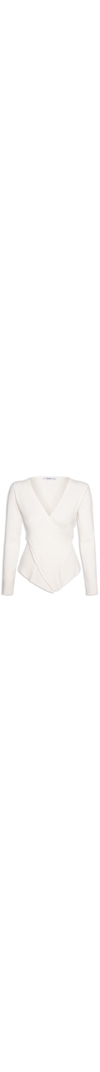 A blusa off white é confeccionada em malha canelada de tricot com média elasticidade. A peça justa ao busto e solta no comprimento possui decote transpassado em V, mangas longas, detalhe frontal com transpasse assimétrico e sobreposição, acabamento canelado em toda a superfície e barra com pontas assimétricas.