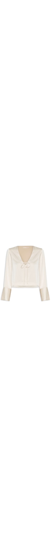 A blusa bege é confeccionada em tecido leve sem elasticidade. A peça solta ao corpo possui decote V com tiras alongadas para amarração, mangas longas com recorte e detalhe de fenda, padronagem listrada com transparência e forro.