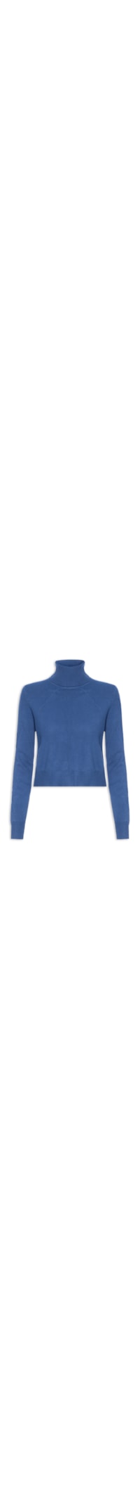 A blusa azul é confeccionada em tricot com alta elasticidade. A peça justa ao corpo possui gola alta e mangas longas.