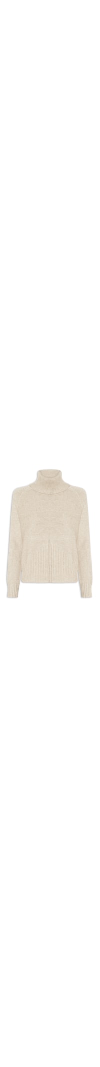 A blusa bege é confeccionada em tricot com média elasticidade. A peça solta ao corpo possui gola alta canelada em sobreposição, mangas longas no corte raglã com punhos em acabamento canelado, corpo trabalhado em ponto canelado e barra em acabamento canelado.