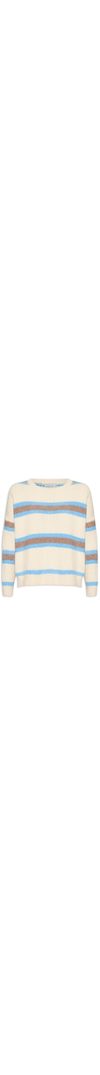 A blusa off white é confeccionada em tricot com superfície texturizada e alta elasticidade. A peça solta ao corpo possui decote redondo, mangas longas com ajuste nos punhos, ombros estendidos, fendas laterais, padronagem listrada nas cores marrom e azul.