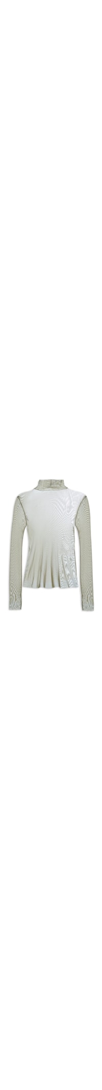 A blusa verde é confeccionada em tule com alta elasticidade. A peça justa ao corpo possui gola alta com logo metalizado da marca aplicado na parte posterior, mangas longas, punhos e barra com acabamento por corte a fio e transparência.