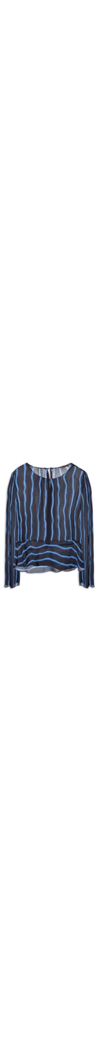 A blusa preta é confeccionada em tecido leve sem elasticidade. A peça possui decote redondo, mangas longas com leve amplitude nos punhos, ombros com caimento deslocado, modelagem solta ao corpo, estampa listrada em tom de azul, recorte na barra com leve efeito peplum, barra arredondada e fechamento posterior por botão.