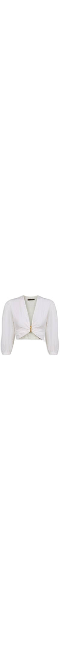 A blusa branca é confeccionada em tecido leve sem elasticidade. A peça solta ao corpo possui decote V profundo, mangas longas amplas com ajuste nos punhos, aviamento metalizado aplicado na parte frontal, detalhe de franzido com efeito drapeado aplicado na parte frontal, abertura frontal e comprimento cropped*.