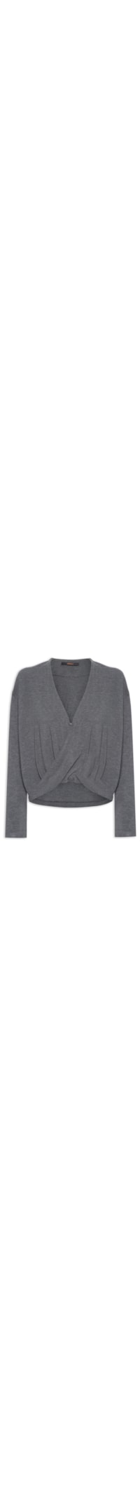 A blusa cinza é confeccionada em tecido leve com baixa elasticidade. A peça solta ao corpo possui decote V com recorte sobreposto e com colchete para fechamento e mangas longas.