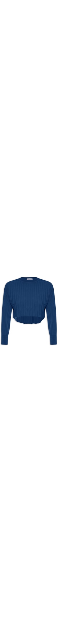 A blusa azul é confeccionada em tricot. A peça possui decote redondo, mangas longas, ombros estendidos, barra mullet*, comprimento cropped*, shape solto, caimento reto e acabamento canelado.