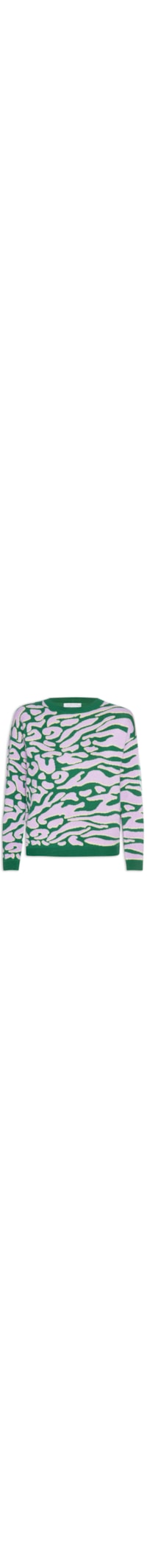 A blusa verde é confeccionada em tricot com alta elasticidade. A peça solta ao corpo possui decote redondo, ombros estendidos, mangas longas com ajuste nos punhos e padronagem abstrata na cor lilás.