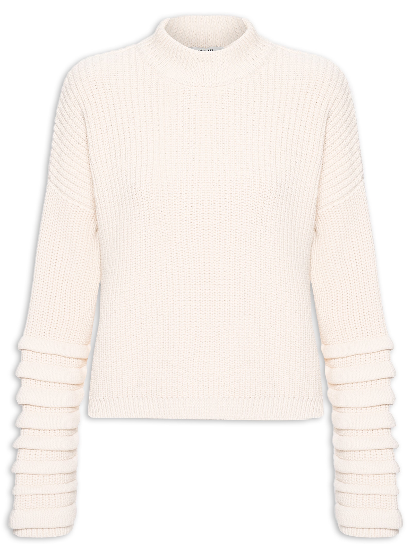 A blusa bege é confeccionada em tricot com superfície texturizada e média elasticidade. A peça solta ao corpo possui gola alta, ombros estendidos, mangas longas com mix de padronagem e tag metalizado da marca aplicada na parte frontal da barra.
