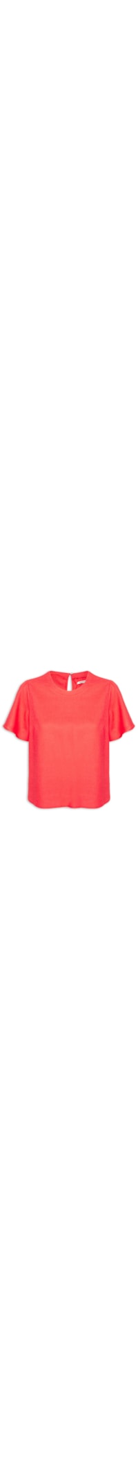 A blusa vermelha é confeccionada em tecido leve com toque de linho sem elasticidade. A peça solta ao corpo possui decote redondo, mangas curtas e recorte posterior vazado com botão aplicado.
