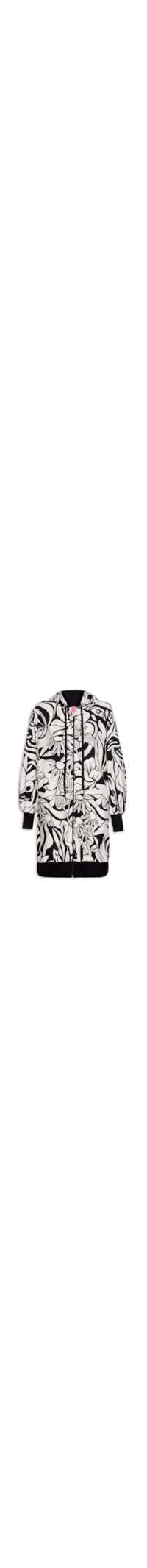 A blusa preta é confeccionada em moletom de baixa elasticidade. A peça solta ao corpo possui capuz com tira alongada embutida para ajuste, ombros estendidos, mangas longas, bolsos frontais, mix de estampas figurativas em tom contrastante, acabamento canelado, comprimento alongado e fechamento frontal em zíper.