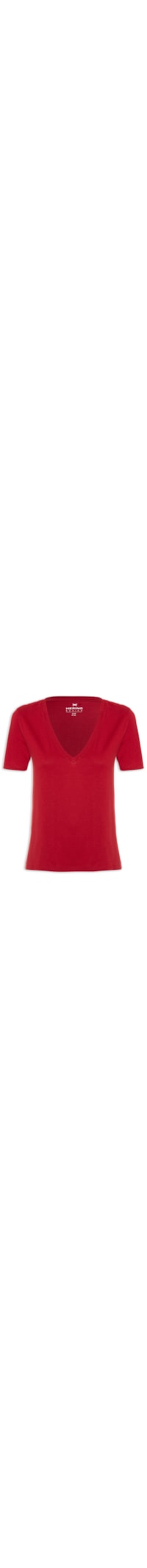 A blusa vermelha é confeccionada em malha de algodão. A peça possui decote v canelado, mangas curtas, shape solto, caimento reto e acabamento pespontado.