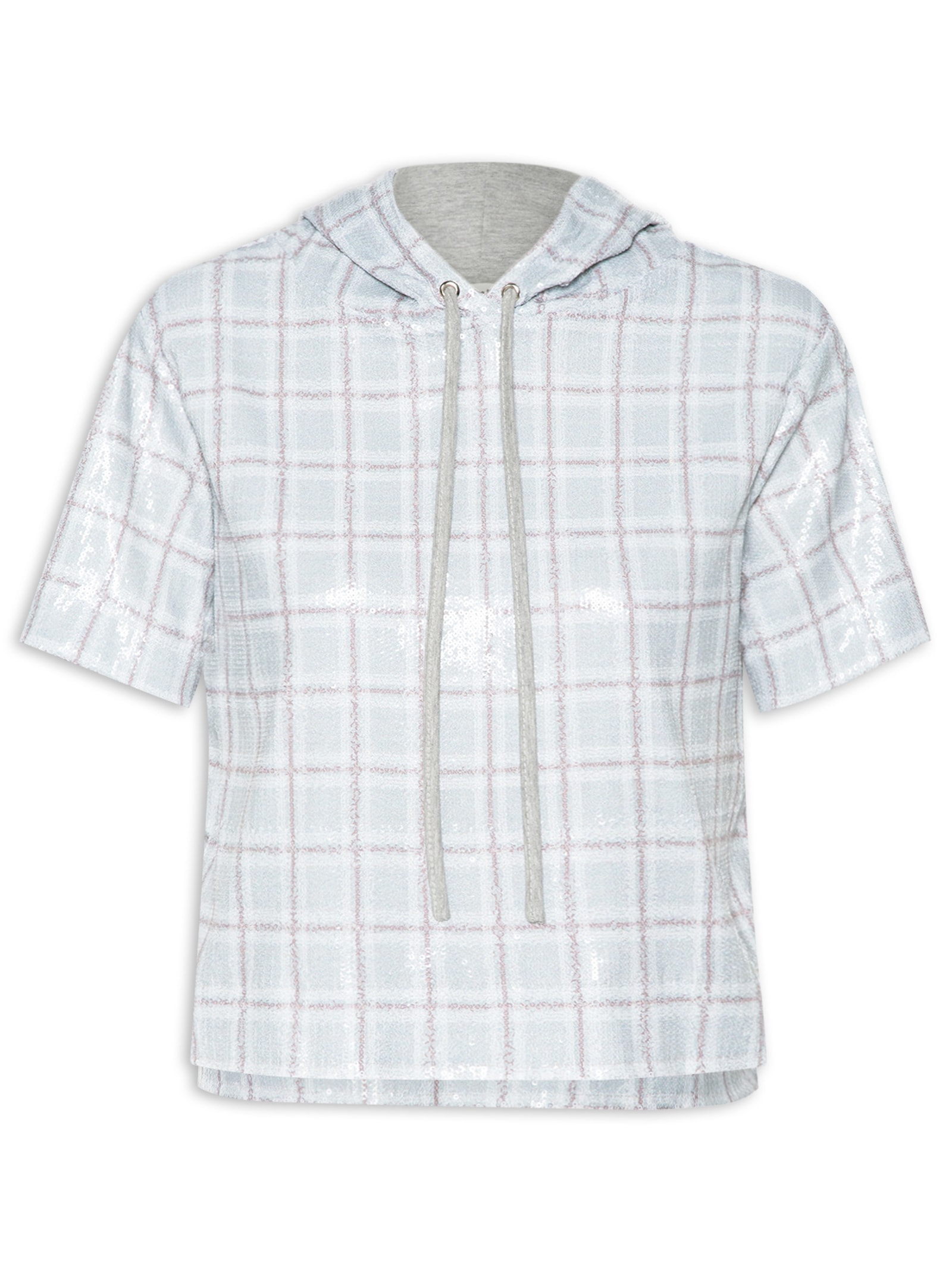 A blusa cinza é confeccionada em moletom com superfície em paetês e média elasticidade. A peça solta ao corpo possui capuz com tira alongada para ajuste e amarração, mangas curtas, fendas laterais, barra mullet*, padronagem xadrez em cores contrastantes e acabamento em corte a fio.